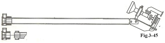 The length of struts is 531mm and root connector is 59mm to ensure compactness of package.(the part is fixed on the flyaway antenna and not dismounted). The whole support structure (including horn, duplexer, rotary joint, strut waveguide, etc.) weighs 1.8kg. It is simple and reliable to connect feed strut and root. Insert one end and point the other to locating pin, hitch to straight knurl nut of strut and then lock. There is waveguide flange on the other end of connector. Connect bend waveguide to power amplifier of the backside flyaway antenna (This section is fixed and not removed). The complete feed system has 2 flange(one with90 scale) supporting on panel of feed strut. When adjusting, loosen flange screw with scale, rotate duplexer in place, and then lock the screw. (3)Flyaway antenna pedestal structure The flyaway antenna pedestal consists of azimuth adjusting device, pitch adjusting device and strut leg. The weight is 6.5kg. Each part of flyaway antenna pedestal can be demounted manually, loaded in bags, and removed and repaired by one person. When assembling flyaway antenna, take parts out from box and assemble manually. Three groups of pedestal support can choose reinforcement and wind-resistance measurement. Nail individually on three foot drives. Or press a sandbag on each strut to fasten fixed pedestal and adjust torsion bar to keep pedestal in horizontal level. Azimuth adjusting mechanism Azimuth adjusting device mainly consists of azimuth turntable, star screw. When roughly adjusting, adjust triangle support. When fine adjusting, loosen star screw and drive azimuth turntable and then can adjust antennas azimuth angle (-0~30). Lock star screw in the time of locking Elevation adjusting mechanism The mechanism is lead screw adjusting. One end is fastened on pedestal; the other end is connected with flyaway antenna reflector. When adjusting El, press knurl tightly and lock jacking block of screw to adjust in a wide range. And then loose jacking block, rotate knurl nut to adjust fine. The pitch range is between 15~50°when using lead screw. The El adjusting mechanism is shown in Fig3-46.